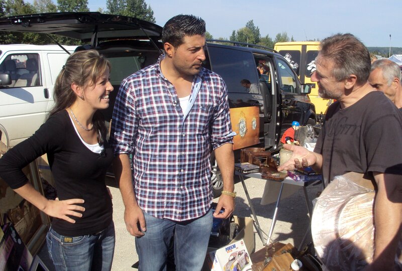 Trödelprofi Sükrü Pehlivan (Mitte) mit Nancy (li.) auf dem Flohmarkt