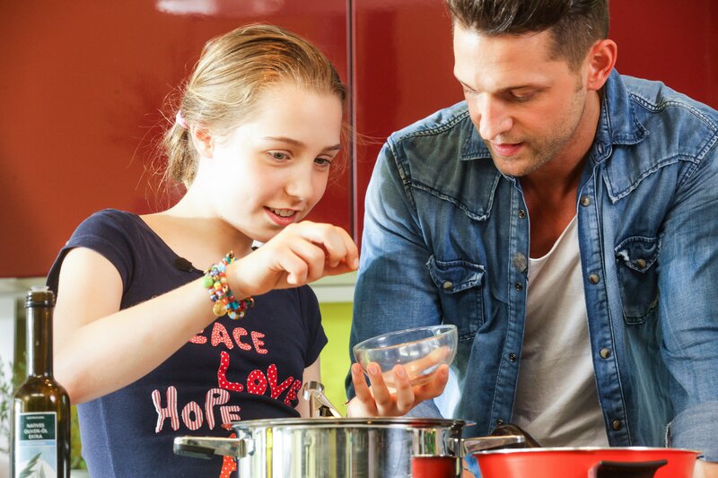 Kartoffelkarottenrösti mit Mangochutney und Karfiolpüree Kinder kochen mit Profikoch Alexander Kumptner ein Gericht für ihre Freunde. Die anderen basteln derweil eine lustige Tischdekoration. Wird das alles klappen? In dieser Folge steht ein vegetarisches Gericht auf dem Kochplan: Es gibt Kartoffelkarottenrösti mit Mangochutney und Karfiolpüree. Auch heute gibt es einen Überraschungsnachtisch: Obstspießchen mit Schokolade. Ob die Kochkids Lou-Anne und Nico die anderen von ihren Kochkünsten überzeugen werden?