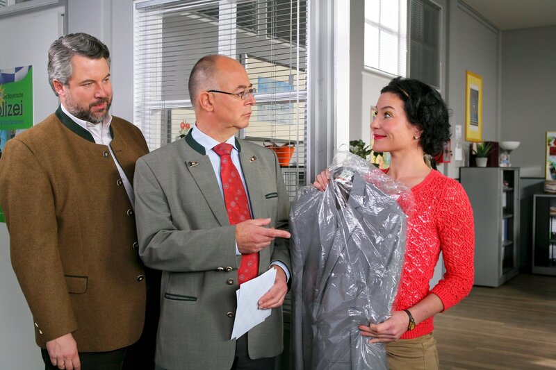 Gert Achtzigers (Alexander Duda, m.) Anzug sorgt nicht nur bei Sekretärin Stockl (Marisa Burger, r.) und Kommissar Stadler (Dieter Fischer, l.) für Verwirrung.