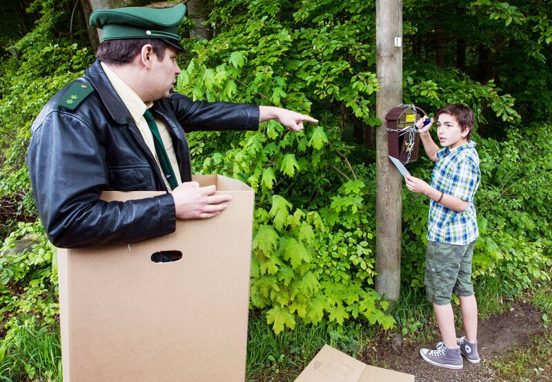 Roman Rieger (Shayan Hartmann, rechts) der dreizehnjährige Sohn von Jens Rieger, öffnet gewaltsam den Briefkasten und entnimmt einen Brief. Dabei bemerkt er nicht, dass Riedl (Paul Sedlmeir) sich in einem Karton versteckt hat und ihn beobachtet. Riedl glaubt den Übeltäter überführt zu haben und will den kleinen Roman zur Rede stellen.