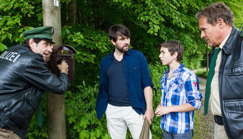 ARD HEITER BIS TÖDLICH - HUBERT UND STALLER, III. Staffel, Folge 33 (Wh.), "Der Tod hat 1000 Stacheln", am Mittwoch (13.05.15) um 18.50 Uhr im Ersten. Staller inspiziert ein an einem Holzpfosten befestigtes Briefkastenhäuschen. Die Klappe ist gewaltsam geöffnet worden. Der Eigentümer Jens Rieger und sein Sohn stehen neben Hubert und Staller und beobachten die Ermittlungen. Im Bild v.l.n.r. Staller (Helmfried von Lüttichau), Jens Rieger (Stefan Evertz), Roman Rieger (Shayan Hartmann), Hubert (Christian Tramitz)