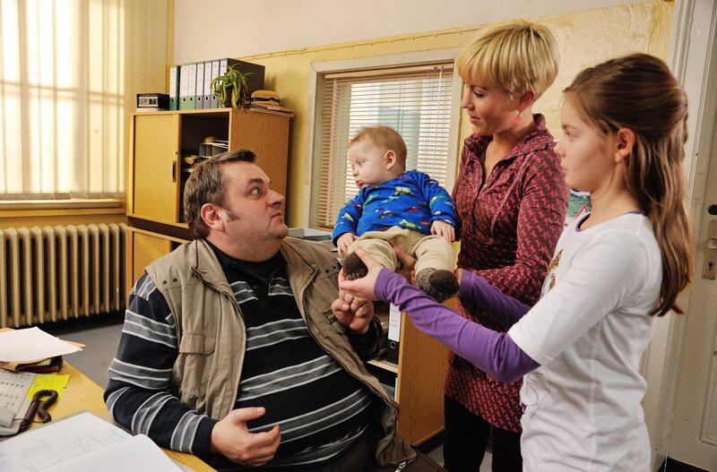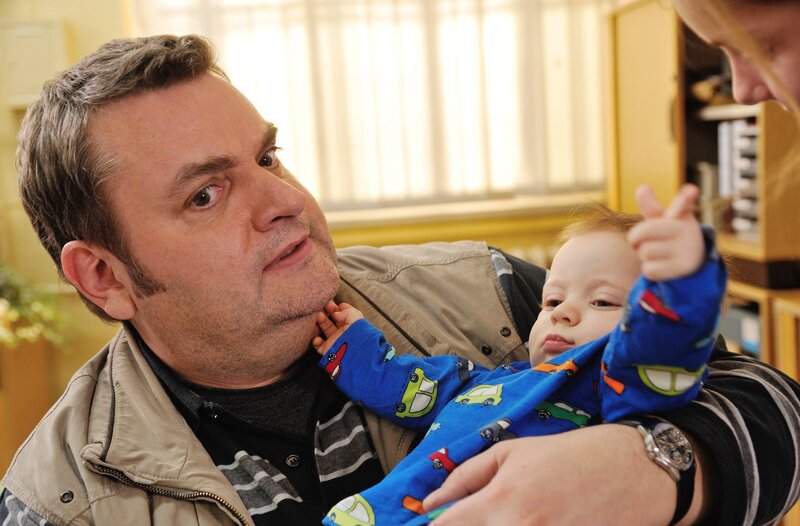 ARD HEITER BIS TÖDLICH - ALLES KLARA II. Staffel (16 neue Folgen), Folge 21 "Pizza Mortale". Ollie (Christoph Hagen Dittmann, l.) soll mal kurz auf Baby Lars (Komparse, r.) aufpassen.