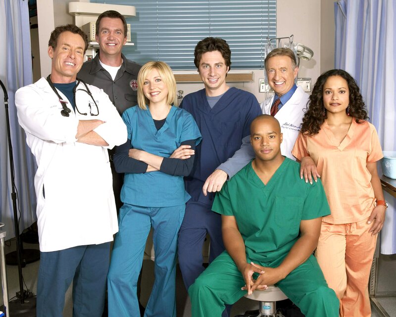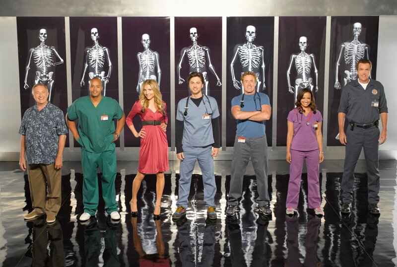 Von links nach rechts: Dr.Perry Cox (John C. McGinley), Der Hausmeister (Neil Flynn), Elliot Reid (Sarah Chalke), John "J.D". Dorian (Zach Braff), Chris Turk (Donald Faison), Dr. Bob Kelso (Ken Jenkins) und Judy Reyes (Carla Espinosa).