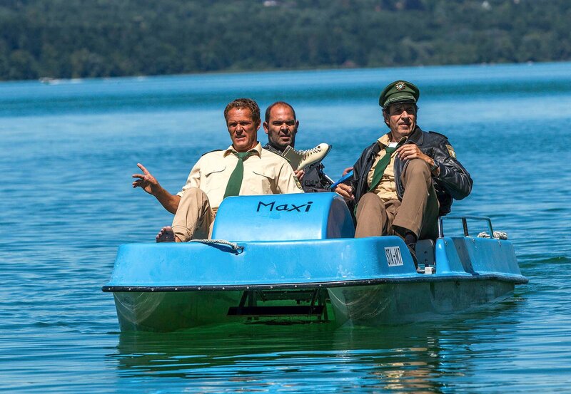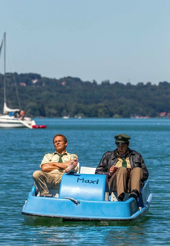 • ARD HEITER BIS TÖDLICH - HUBERT UND STALLER FOLGE 36 (WH.), "Dünnes Eis", am Mittwoch (03.06.15) um 18:50 Uhr im ERSTEN. Hubert (Christian Tramitz, l.) und Staller (Helmfried von Lüttichau, r.) sitzen in einem Tretboot und fahren auf den See hinaus. Yazid (Hannes Ringelstetter, M.) sitzt hinter ihnen in Tauchermontur. Er soll für Hubert und Staller testen, ob man mit einem Schlittschuh unter Wasser an einer Boje hängen bleiben kann.