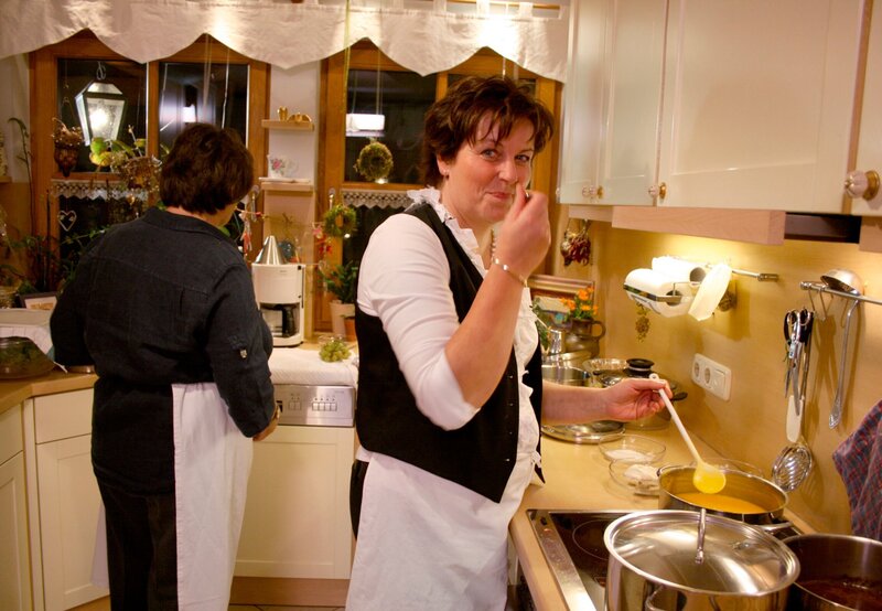 Beate Loos betreibt zusammen mit ihrem Mann ein Weingut im fränkischen Dingolshausen. Klar, dass sie ihren kulinarischen Gästen zum Empfang einen Sekt aus eigener Produktion anbietet. Dazu reicht sie Brote aus typisch fränkischem Steigerwälderteig mit Apfel-Zwiebelaufstrich. Beates Abend steht unter dem Motto "Wald und Wein" - die Tische im Weingut werden mit Moos dekoriert. Während Beate mit den Vorbereitungen beschäftigt ist, führt ihr Mann Armin die Landfrauen zum Tanzen aus. Die örtliche Kapelle spielt auf, und die Landfrauen werden gleich zum Mitmachen aufgefordert. Derart musikalisch beschwingt, erwartet sie ein fränkisches 3-Gänge-Menü. Zur Vorspeise reicht Beate eine Kürbiscremesuppe. Den Kürbis hat sie gerade aus dem eigenen Garten geholt, denn auch sie legt großen Wert auf heimische Zutaten. Als Hauptgericht bietet sie den Landfrauen Rehmedaillons mit "Weckklös" - fränkischen Semmelknödeln. Die Soße wird mit etwas Rotwein vom eigenen Weinberg abgeschmeckt. "Sehr süffig", finden die Landfrauen den Loos-Wein und schenken gleich noch mal nach. Zum Abschluss wird noch ein Eiswein gereicht. Beate gesellt sich zu ihren Gästen und fragt vorsichtig in die Runde, ob sie den Geschmack ihrer Gäste getroffen hat.