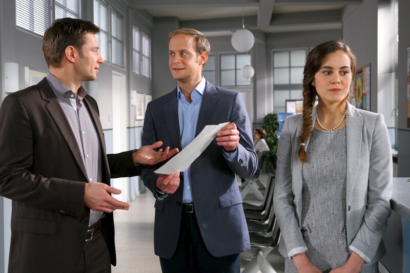 Hansen (Igor Jeftic, 2.v.l.), Hofer (Joseph Hannesschläger, r.) und Mohr (Max Müller, 2.v.r.) vermuten, dass das Ehepaar Meissner (Jutta Fastian, m.; Frank Röth, l.) hinter dem Verbrechen steckt.