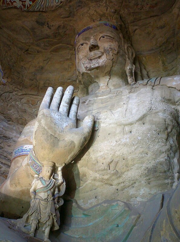 In den Yungang-Grotten, hat sich der indische Buddhismus zu einer chinesischen Volksreligion gewandelt. Im 5. Jahrhundert wurde die Fremdreligion des Buddhismus von den Kaisern der Wei-Dynastie aus politischen Gründen zur Staatsreligion erklärt. Der Buddhismus hat jedoch schnell viele Vorstellungen aus dem alten chinesischen Geisterglauben und aus dem Daoismus absorbiert. Die Darstellungen werden bewegter, bunter, die Figuren kleiner, menschlicher. In Yungang hat der Buddhismus sein chinesisches Gesicht bekommen.