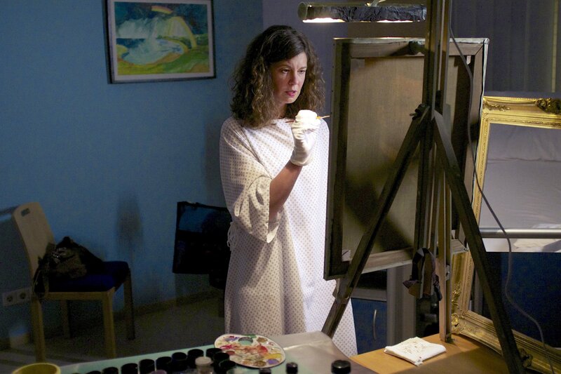 Iris Markgraf (Claudia Hübschmann) hat ihren Praktikanten Arthur Dosse gebeten, ihr ein noch fertigzustellendes Gemälde aus der Restaurationswerkstatt in die Sachsenklinik zu schmuggeln.