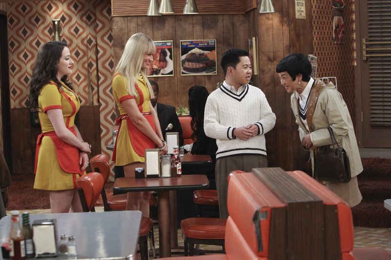 • Für Lee (Matthew Moy, 2.v.r.) bedeutet der spontane Besuch seiner Mutter Su-Min (Karen Maruyama, r.) Stress pur. Max (Kat Dennings, l.) und Caroline (Beth Behrs, 2.v.l.) sollen für ihren Chef eine Stripperin organisieren, die sich als seine Freundin ausgibt ...