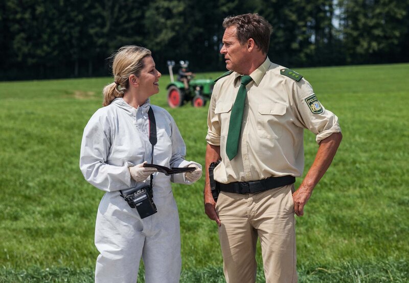 ARD HEITER BIS TÖDLICH - HUBERT UND STALLER FOLGE 34, "Viel Wind um nichts", am Mittwoch um 18:50 Uhr im ERSTEN. Dr. Anja Licht (Karin Thaler, l.) zeigt Hubert (Christian Tramitz, l.) das Foto einer Frau aus der Geldbörse des Toten.
