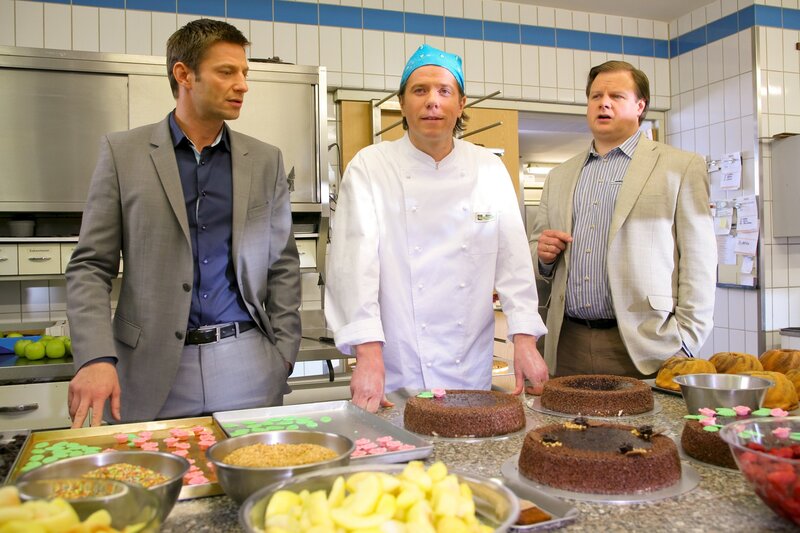 Als Hartl (Michael A. Grimm, r.) und Hansen (Igor Jeftic, l.) herausfinden, dass Jens Breuer (Martin Spitzweck, M.) ein besonderes Verhältnis zur Toten hatte, gerät der Bäckergeselle unter Druck.