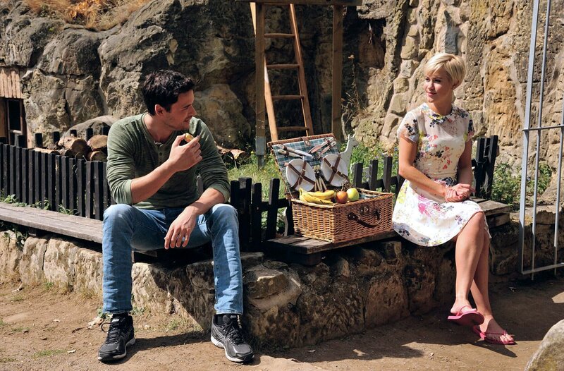 Klara (Wolke Hegenbarth, r.) unternimmt mit ihrem Nachbarn Thomas Wolff (Alex Milo, l.) einen Picknick-Ausflug ins Grüne. Sie besichtigen die Höhlenwohnungen in Langenstein.