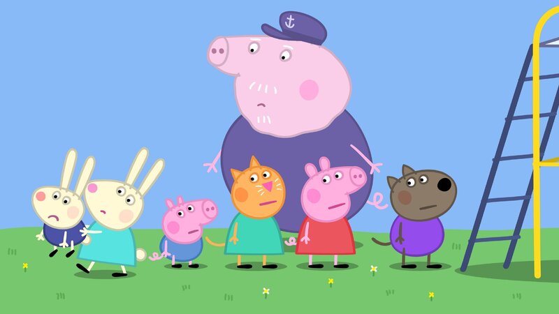 Opa Wutz (hinten) ist mit Peppa (2.v.r.) und Schorsch(3.v.l.) auf dem Spielplatz. Dort mischt er sich in die Spiele der Kinder ein, und bald tanzen ihm alle auf der Nase rum. Ob das gut geht?