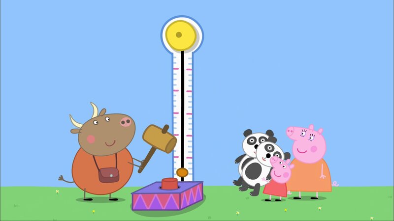 Die ganze Familie ist auf der Kirmes. Während Schorsch und Papa rutschen sind, versuchen Mama und Peppa einen riesigen Teddybären zu gewinnen.