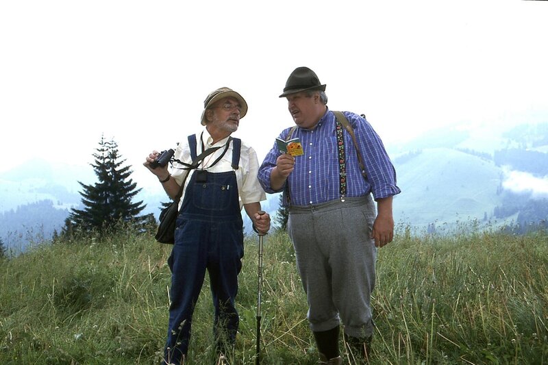 • Peter (Peter Lustig, l.) hat seinen Nachbarn Paschulke (Helmut Krauss, r.) in die Berge gelockt, damit er etwas Bewegung bekommt. Jetzt bewundern beide das herrliche Alpenpanorama.