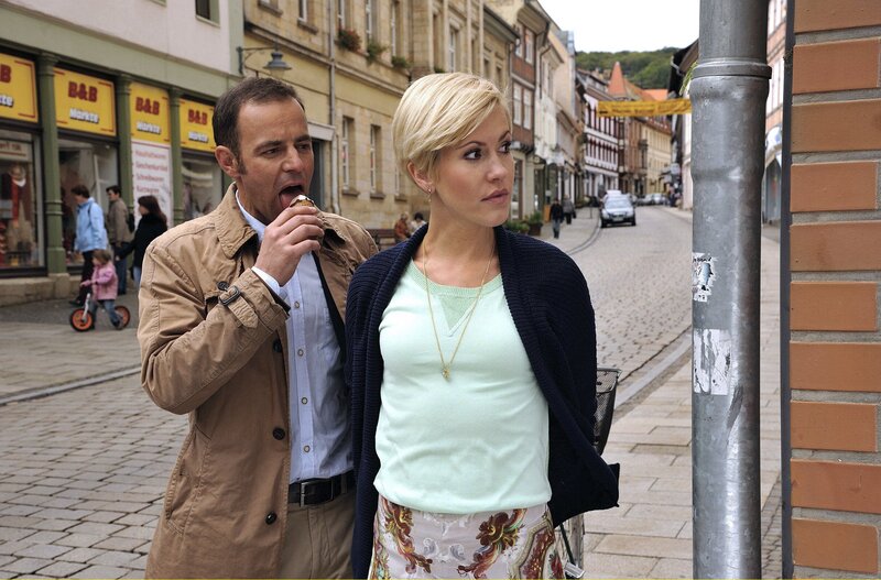 Klara (Wolke Hegenbarth, r.) verfolgt Anne Bramstedt in den Straßen von Quedlinburg, Hauptkommissar Paul Kleinert (Felix Eitner, l.) schleckt sein Eis.
