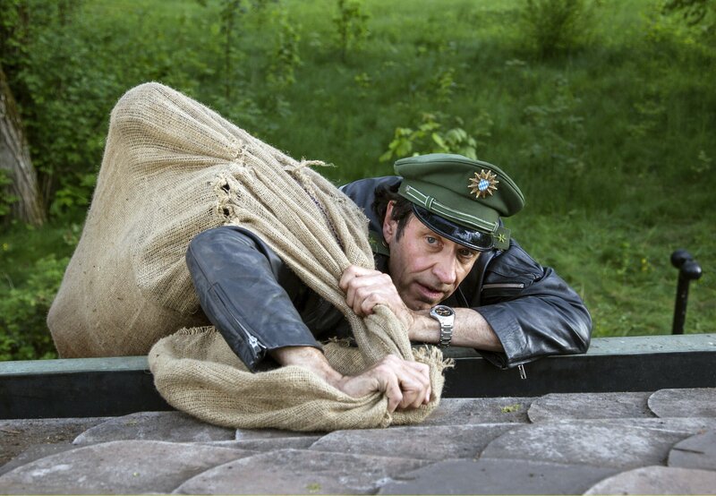 Staller (Helmfried von Lüttichau, rechts) ist der Sack mit dem Butler vom Dach gefallen. Hubert (Christian Tramitz) fragt sich, ob man die Figur noch reparieren kann.