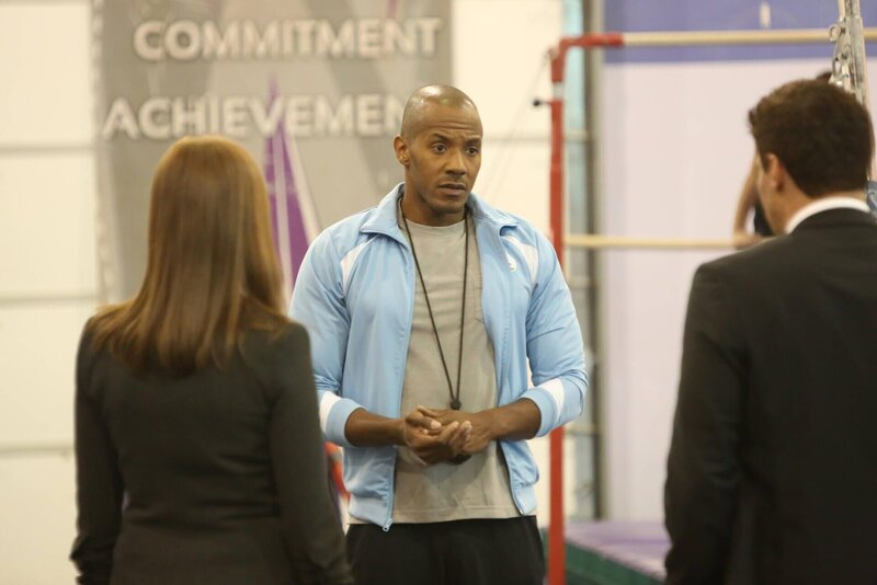 Brennan (Emily Deschanel) und Booth (David Boreanaz, r.) befragen den Trainer Davis McIntyre (McKinley Freeman) zum Mord an der Turnierin Amanda Watters.