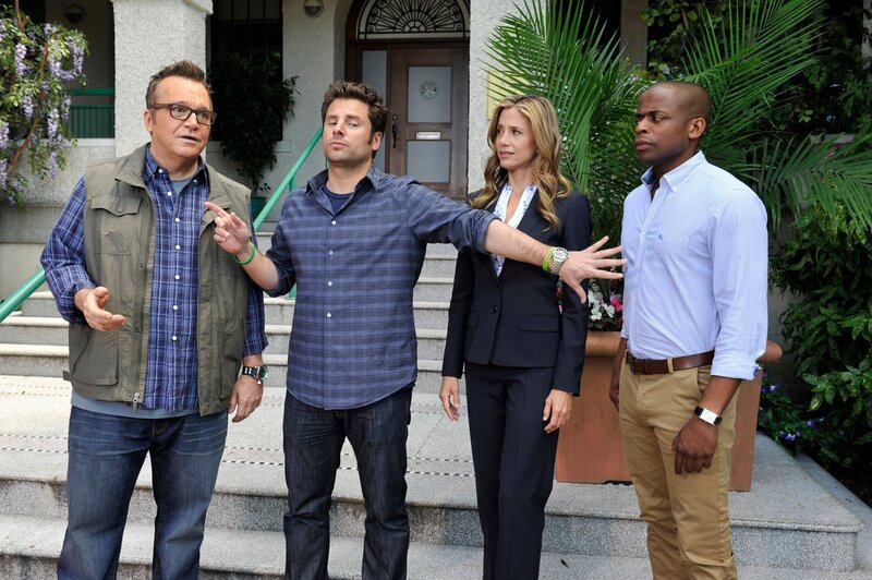 PSYCH - 'A Touch Of Sweevil' Episode 808. Pictured: Yvette Nicole Brown as Hazel Lazarus, Tom Arnold as Garth, James Roday as Shawn Spencer, Mira Sorvino as Betsy.
