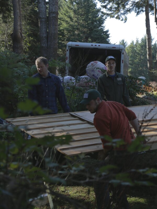 Während des Baus des Sky High Redwood Retreat Treehouse.