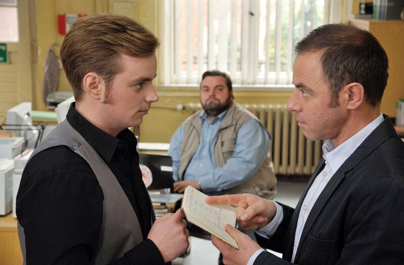 Jonas Wolter (Jan Niklas Berg, l.) und Hauptkommissar Kleinert (Felix Eitner, r.) diskutieren im Beisein von Ollie (Christoph Hagen Dittmann, M.) die Bankdaten des Yogastudios.
