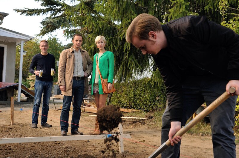 Gunnar Siebert (Daniel Drewes, l.), Hauptkommissar Paul Kleinert (Felix Eitner, 2.v.l.) und Klara (Wolke Hegenbarth, 2.v.r.) beobachten Jonas Wolter (Jan Niklas Berg, r.), der auf Mechtersheim Grundstück nach der Leiche von Mechtersheim gräbt.
