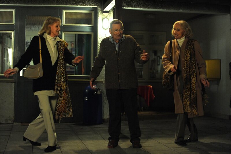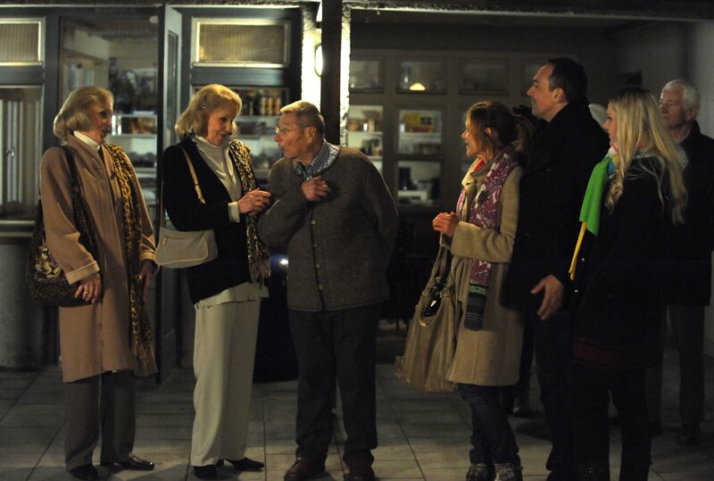 Die Kessler Zwillinge sind froh, dass ihnen die Überraschung gelungen ist. Von links: Alice und Ellen Kessler, Alois (Erich Hallhuber), Trixi (Doreen Dietel), Mike (Harry Blank) und Yvonne Preissinger (Alexa Eilers).