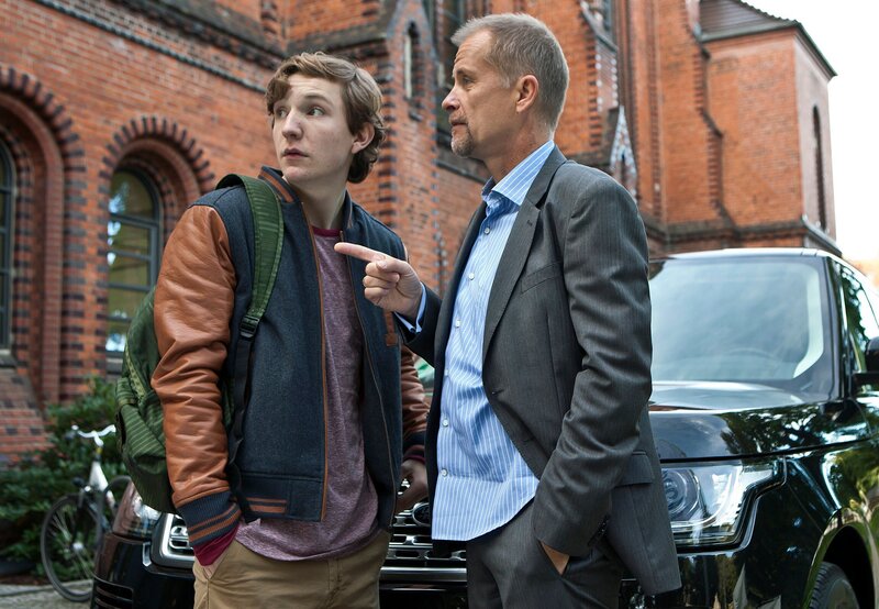 Lehrer Pawel Hagen (Lee Rychter, 3.v.r.) scheint in der Gunst der Schüler hoch zu stehen. (v.l.n.r.: Komparse, Leonard Carow, Paul Cybulska, Lee Rychter, Komparse, Aaron Altarashoch)