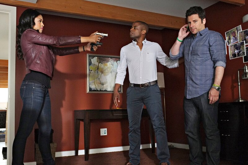 PSYCH -- "COG Blocked" Episode 805 -- Pictured: (l-r) Kali Hawk as Emanuelle, Dule Hill as Gus Guster, James Roday as Shawn Spencer.