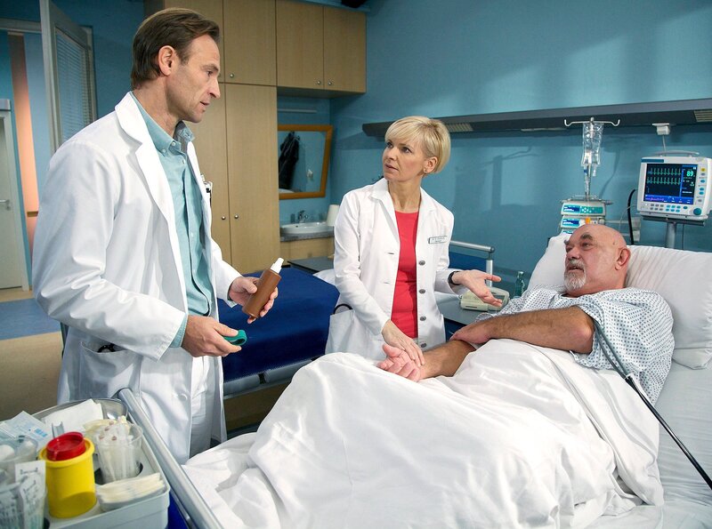 Nun ist es soweit: Schwester Yvonne (Maren Gilzer, links) soll offiziell Oberschwester werden. Jahrelang hat sie darauf hingearbeitet und nun kann sie sich gar nicht darüber freuen. Als Professor Simoni (Dieter Bellmann, rechts) und Oberschwester Ingrid (Jutta Kammann) sie darauf ansprechen, redet Yvonne um den wahren Grund für ihre betrübte Stimmung herum.