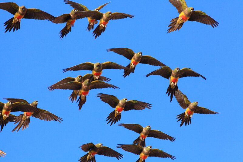 Ein Schwarm Felsensittiche im Flug, El Condor, Argentinien