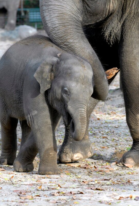 Viel Milchtrinken, Zunehmen und Wachsen ist das eine. Ebenso wichtig das Spielen. Zum Glück gibt es genügend Tanten und eine Schwester für das acht Tage alte asiatische Elefantenkind Koraya im Zoo.