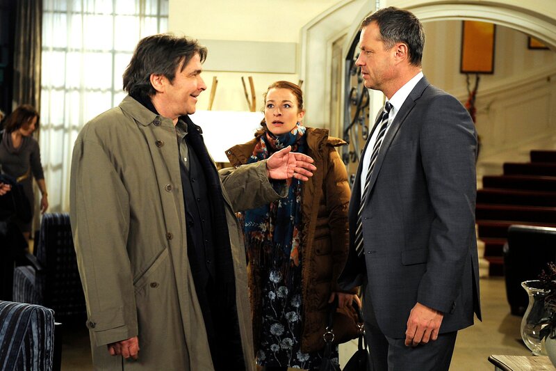 Carla (Maria Fuchs, M. mit Joachim Kretzer, r.) stellt Nicos (Markus Graf, l.) ein Ultimatum: Entweder er reist sofort ab und versteuert das Geld oder sie bricht mit ihm.