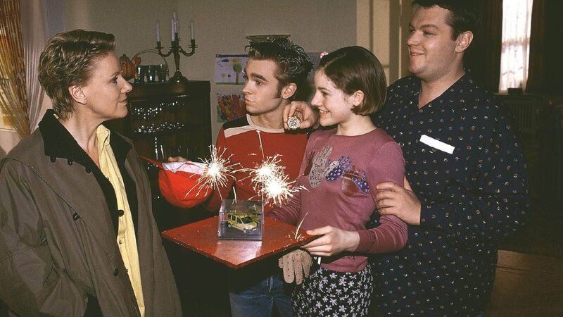 (v.r.:) Tim (Oliver Reinhard), Stephanie (Frederike Grasshoff) und Peter (Eric Benz) wünschen Nikola (Mariele Millowitsch) alles Gute zur Fahrschulprüfung.