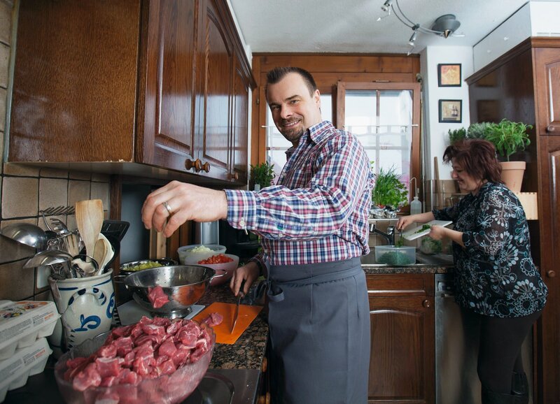 Arthur Röösli is(s)t am liebsten daheim, auf seinem Hof, im luzernischen Hohenrain. Ein gutes Stück Fleisch, vom eigenen Schwein, eine raffinierte Vorspeise und ein leichtes Dessert, dazu ein Glas Schweizer Wein, das sind die Zutaten für einen perfekten Abend mit Freunden und Gästen. Wenn für einmal vier Männer am Tisch sitzen, die seine Kochkünste bewerten, dann bringt das Turi, wie ihn alle nennen, nicht aus der Ruhe - denkt er. Das Wettessen für "SRF bi de Lüt - Männerküche" bringt den bodenständigen Schweinezüchter doch noch ins Schwitzen. Nicht, weil gerade zwei Sauen im Stall am Gebären sind, sondern weil Turi nicht sicher ist, ob sein Basilikumglacé für die Vorspeise gelingt und die Röstikroketten kompakt bleiben. Hauptsache, seine Gäste müssen nicht mit leerem Magen vom Tisch.