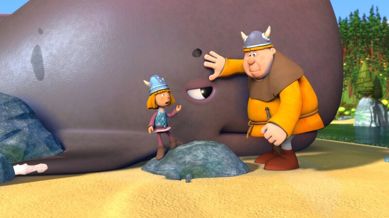 Kaum darf Faxe ausnahmsweise mal als Steuermann den Kurs des Drachenbootes bestimmen, taucht auch schon einer seiner geliebten Walfische auf und beginnt ein Wettrennen mit dem Wikingerboot. Das Rennen auf hoher See und in vollem Tempo macht allen solange Spaß, bis der Wal ein paar Felsen, die einer Insel vorgelagert sind, übersieht, mitten hinein rauscht, festgeklemmt wird und sich alleine nicht mehr befreien kann. Können die Wikinger helfen?