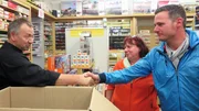• Heidi und Trödelexperte Andreas Bierschock (re.) versuchen die Modelleisenbahn zu verkaufen..