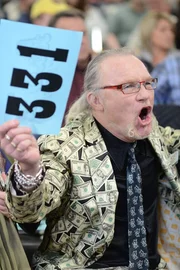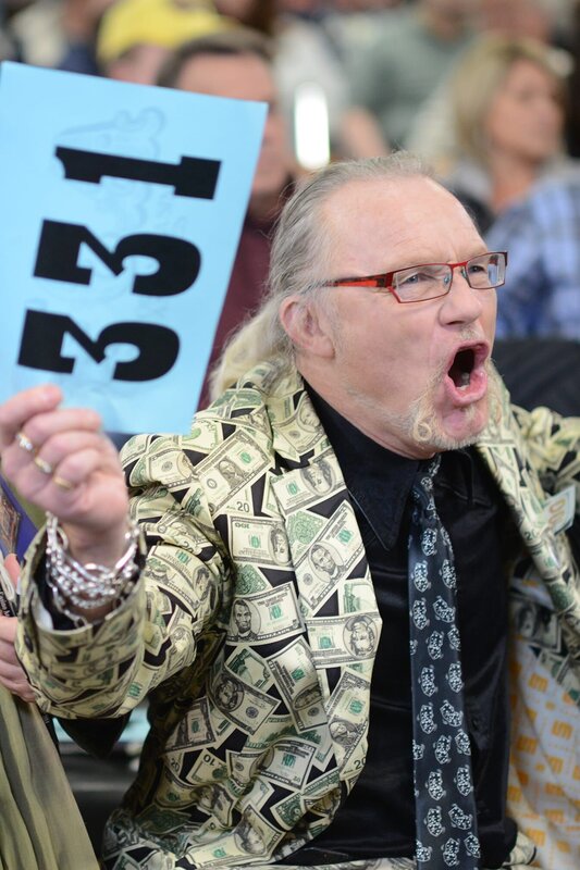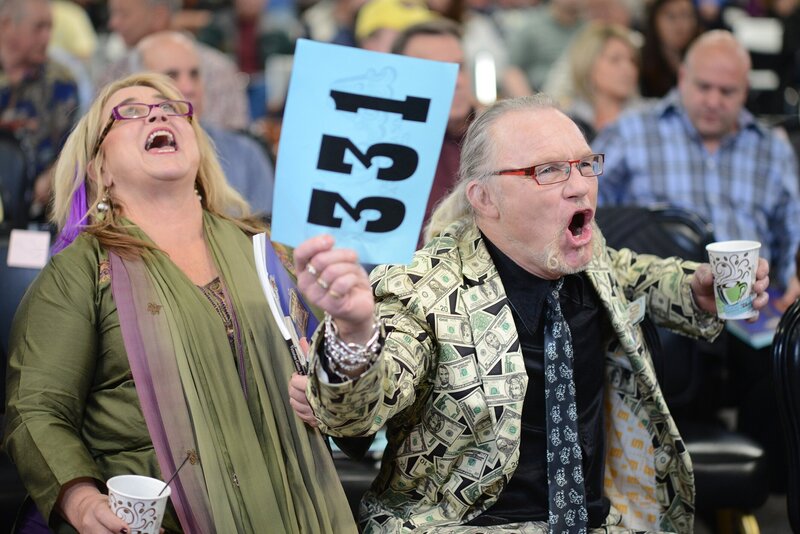 Laurence holds up his number and celebrates a winning bid in Nashville as Sally sits nearby and smiles.