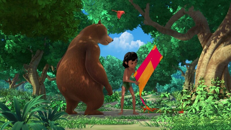 • Mogli (r.) hat einen Drachen gefunden. Zusammen mit dem kleinen Vogel Darsi will er mit dem neuen bunten Fluggerät spielen gehen.