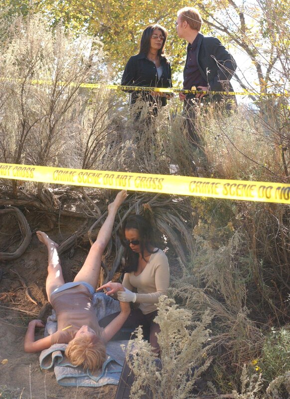 Eine junge Frau (Danica Stewart) wurde ermordet. Horatio (David Caruso, o.re.) und Sevilla (Wanda de Jesus, o.li.) sprechen über einen möglichen Tathergang, Woods (Khandi Alexander) untersucht die Leiche.