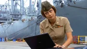 Lieutenant Commander Harm Rabb (David James Elliott, l.), Major Sarah "Mac" MacKenzie (Catherine Bell, M.) und Lieutenant Bud Roberts (Patrick Labyorteaux, r.) beobachten die Schleifermethoden von Rivers.