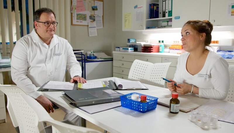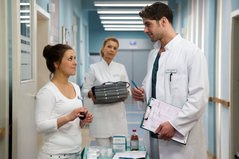 ARD/MDR IN ALLER FREUNDSCHAFT FOLGE 658, "Herzstillstand", am Dienstag (16.09.14) um 21:00 Uhr im ERSTEN. Schwester Julia (Sarah Tkotsch, li.) ist bis über beide Ohren in Dr. Niklas Ahrend (Roy Peter Link, re.) verliebt. Durch eine kleine Schwindelei ergibt sich die Gelegenheit zu einem gemeinsamen Nachmittag und einem Basketballspiel. Doch der Dienstplan macht ihr einen Strich durch die Rechnung. Julia kann Oberschwester Ingrid (Jutta Kammann, mi.) keinen triftigen Grund nennen, um den Dienst zu tauschen.