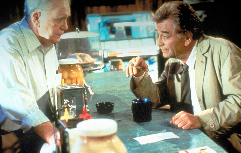 "Columbo - Der Tote in der Heizdecke", Die reiche Witwe Lauren Staton wird seit langem von ihrem Liebhaber Nick mit der schönen Lisa betrogen. Die beiden Frauen wissen aber über die Untreue des geldgierigen Gigolos Bescheid und beschließen, ihn aus der Welt zu schaffen. Lauren erschießt ihn, und ihr Alibi scheint zunächst auch sicher. Bis Columbo am Tatort eintrifft und seine Bedenken hat. Im Bild (v.li.): Bill Macy (Mr. Ruddock), Peter Falk (Lt. Columbo).