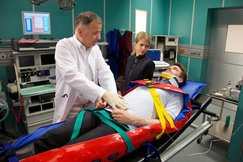 ARD/MDR IN ALLER FREUNDSCHAFT, FOLGE 660, "Böses Blut", am Dienstag (30.09.14) um 21:00 Uhr im ERSTEN. Nach einem Reitunfall wird Sebastian von Lahnstein (Sebastian Schlemmer, liegend) in die Sachsenklinik eingeliefert. Während er sich mit Schmerzen in die Hände von Chefarzt Dr. Roland Heilmann (Thomas Rühmann, li.) begibt, besteht seine Begleitung Gräfin Tanja von Lahnstein (Miriam Lahnstein, mi.) darauf, dass nur das Nötigste gemacht und Sebastian dann zu seinem Arzt nach Düsseldorf verlegt wird.