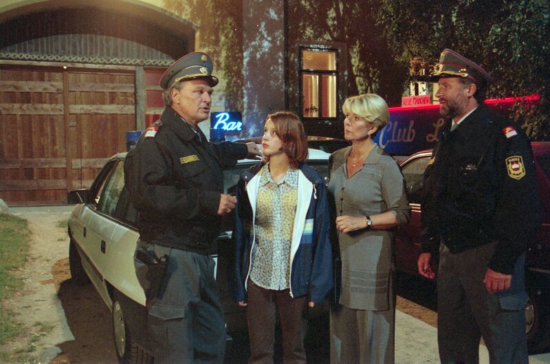 Jelena fährt mit dem Gendarmen Heinz Strubreiter und Gustl Rauscher zum Cafe Lambada. Julia begleitet sie (v.li.: Michael König, Tania Panhofova, Christiane Hörbiger, Ludwig Dornauer).