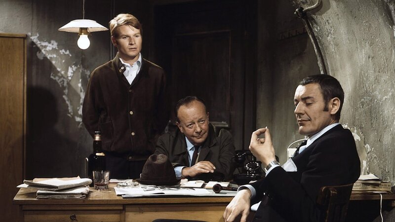 hintern-vorne: Harry Klein (Fritz Wepper), Kommissar Keller (Erik Ode), Proschitz (Günther Ungeheuer)