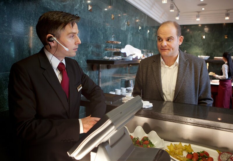 ARD HEITER BIS TÖDLICH - HAUPTSTADTREVIER, FOLGE 31, "Besuch aus der Vergangenheit". Johannes Sonntag (Matthias Klimsa, r.) erfährt von Annoncier Donald Mertens (Nils Nelleßen, l.), dass Julia den Kellner kannte.