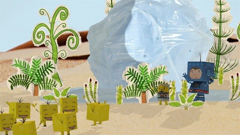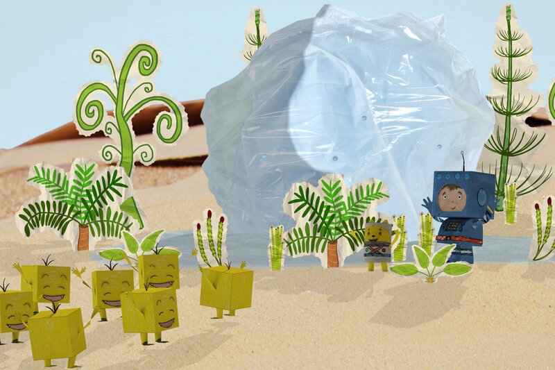 Raketenflieger Timmi: Wüstenplanet: Timmi und Teddynaut fliegen durch das All, als ihnen plötzlich Eisberge entgegenkommen. Schnell landet Timmi, doch ausgerechnet auf einen Planeten, auf dem alles vertrocknet ist und staubt. Also springt er wieder in seine Rakete und fängt einfach einen Eisberg ein. Die Bewohner jubeln, als sie sehen, wie der Eisberg schmilzt und ein See entsteht und rings um den See Pflanzen und Bäume wachsen.