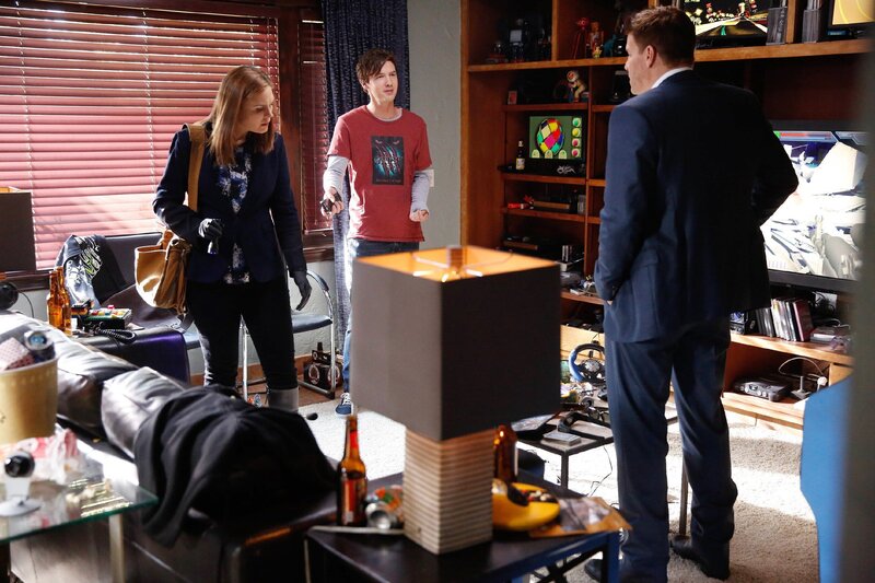 Brennan (Emily Deschanel) und Booth (David Boreanaz, r.) befragen Noah Gummersall (Erik Stocklin), der mit dem ermordeten Robertson zusammenwohnte und offensichtlich die ganze Arbeit für ihn erledigte.