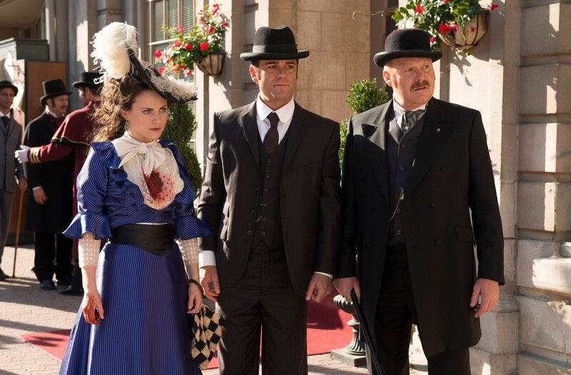 v.l.n.r.: Dr. Grace (Georgina Reilly), die sich als Mlle. Deneuve ausgibt, Murdoch (Yannick Bisson) und Brackenreid (Thomas Craig) reagieren überrascht auf Crabtrees Auftreten.